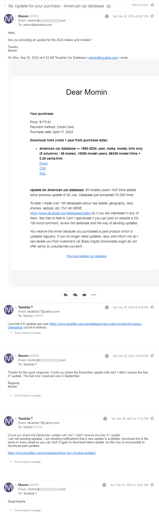 Update frequency vary from monthly to yearly depending by topic and sales volume of each database. When I publish updates I click “resend receipt” in WordPress dashboard to notify all customers who purchased that particular database that an update is available, to re-download if they need. If you do an one-time research and do not need updates, please inform me to delete you from customers list, DO NOT report my emails as SPAM which cause email notifications to no longer reach inbox of other customers who need updates.
