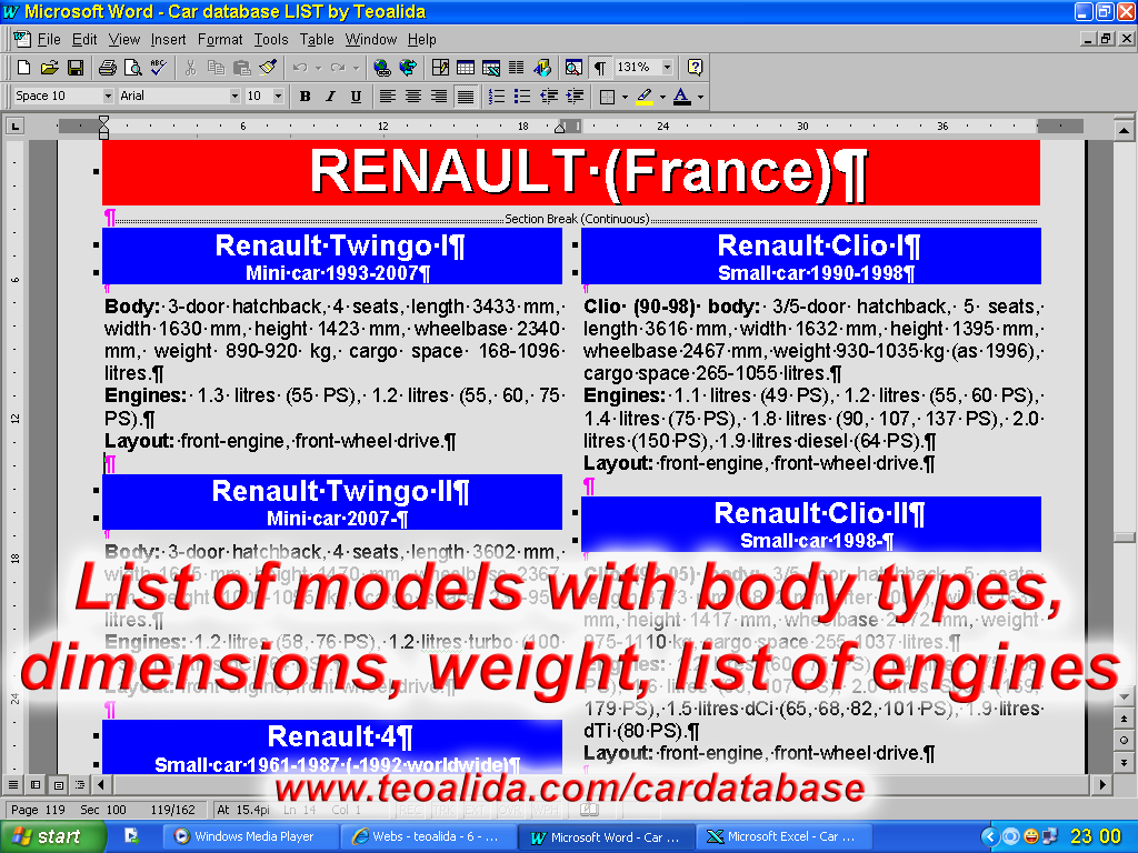 | Car Models List (Worldwide) | free | DOC | 403 | 59 pages | manual | 2003 | abandoned 2015 (free product no updates) |